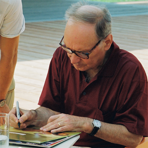 Ennio Morricone signiert einige der Mondo LPs beim Filmfestival in Locarno 2003.